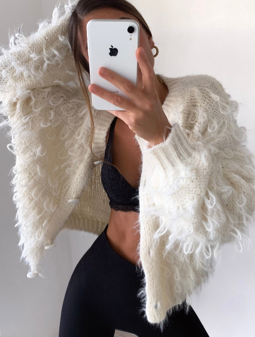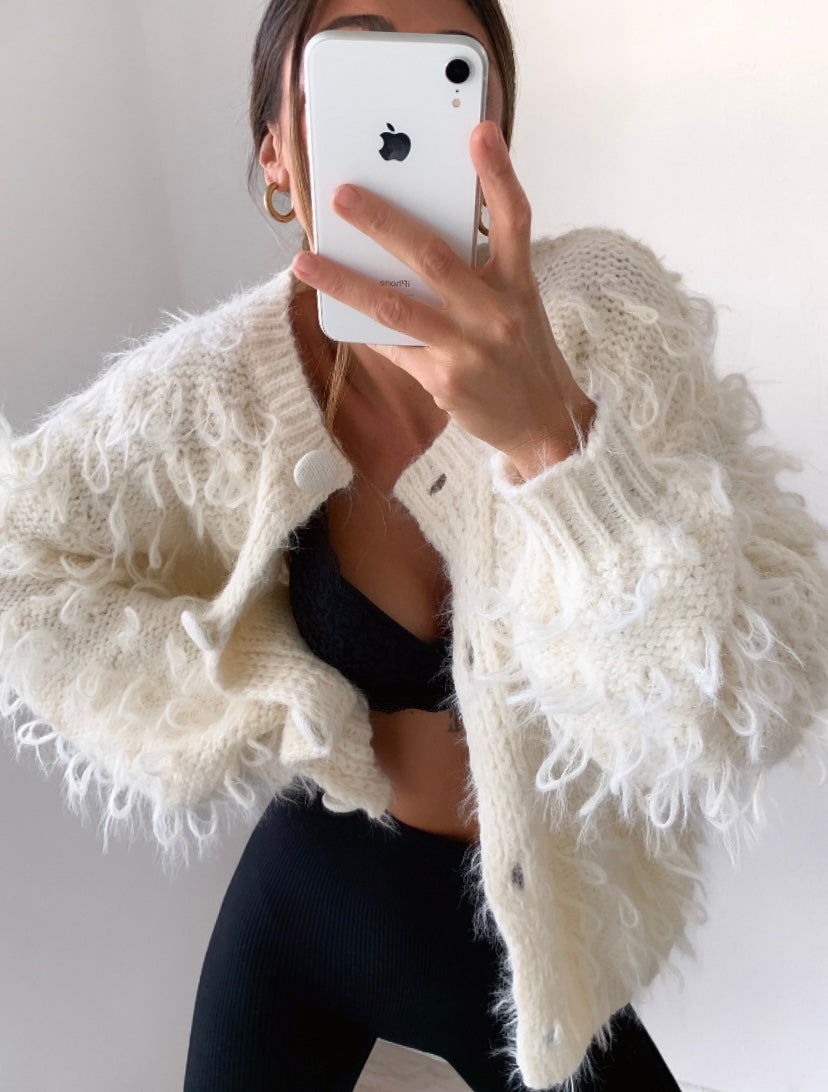 Cardigan color burro, chiusura a bottoni.