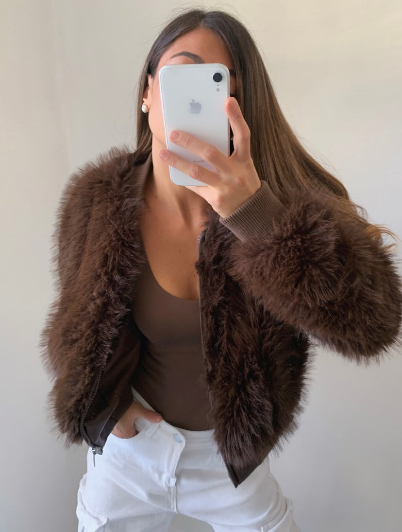 Ecopelliccia con chiusura a zip e tasche, interno foderato.