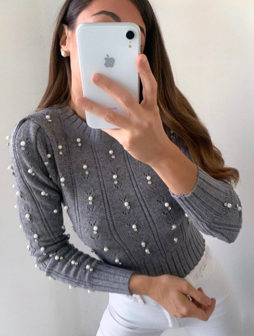 Maglioncino girocollo con perle e strass (applicati solo sulla parte frontale).